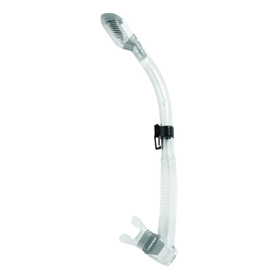 Der Cressi Dry Schnorchel hat oben ein beispielloses Ende, das mit einem speziellen Ventil mit einem 100% Anti-Splash-Bojensystem ausgestattet ist, das das Rohr in dem Moment abdichtet, in dem es untergetaucht ist, und das Eindringen von Wasser verhindert. Das Innenteil hat eine glatte innere Silikonriffelung, die das Mundstück immer richtig positioniert hält und den Atemregler nicht stört, wenn er in den Mund genommen wird. Das Silikon-Mundstück ist außerordentlich anatomisch und baugleich mit dem Atemregler. Ein spezieller Behälter mit elliptischer Entleerungsmembran erleichtert das Ausstoßen von Wasser mit minimalem Aufwand.
