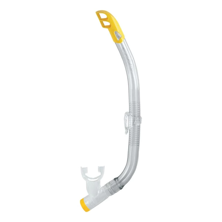 Der Kinderschnorchel Cressi Top ist ein kleiner Schnorchel, der speziell für Frauen und Kinder entwickelt wurde. Sie ist flexibel und hat einen höhenverstellbaren Befestigungsclip für die Maske. Das Rohr endet oben mit einem Spritzschutz, der das Eindringen von Wasser auch bei Wellengang verhindert. Darüber hinaus wurde das Silikonmundstück so konzipiert, dass es auch bei längerem Gebrauch ein hohes Maß an Komfort bietet. Am unteren Ende des Schlauchs befindet sich das elliptische Silikonauslassventil, das die Entleerung des Beatmungsgeräts erleichtert. Ein Behälter verhindert den Rückfluss von Wasser und lässt die Luftzirkulation immer vollkommen frei.